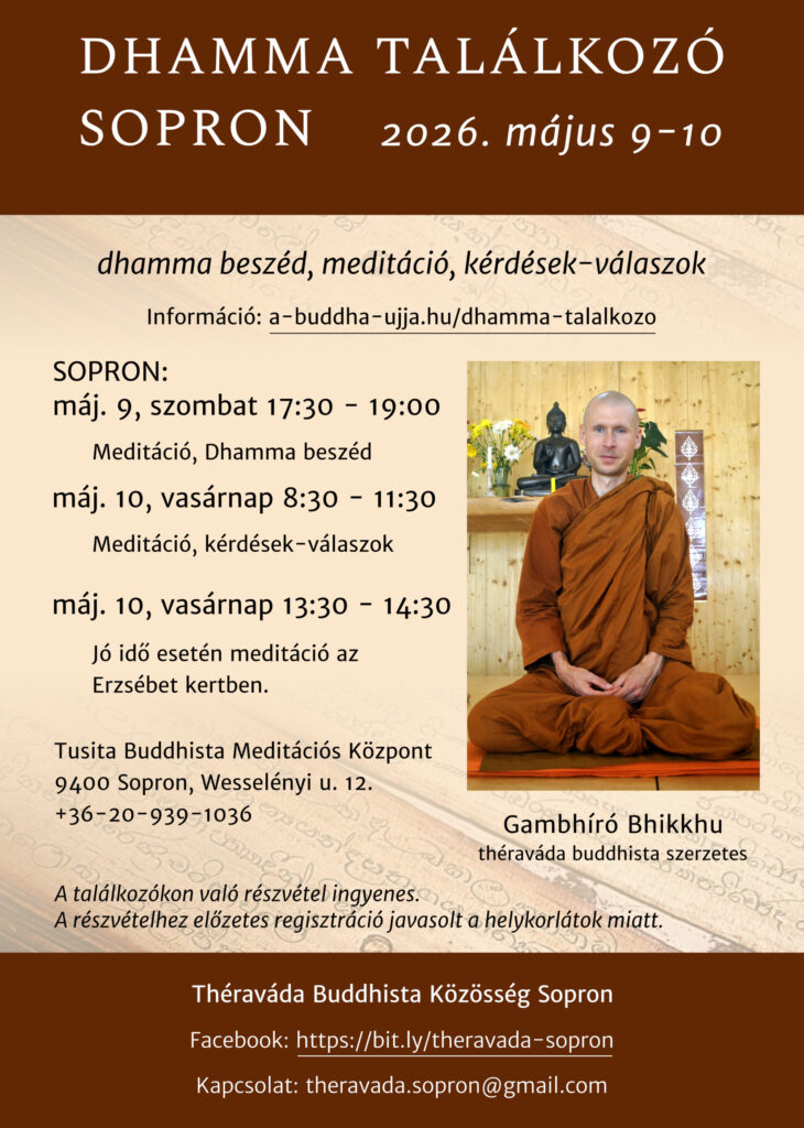 Immár hatodik alkalommal rendez a Soproni Buddhista Théraváda Közösség találkozót a tiszteletreméltó Gambhíró Bhikkhuval sopronban, a Tusita Buddhista Meditációs Központban, május 9-10-én. Az esemény keretein