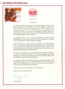 “Mai világunkban világosan látszik, hogy az a hajlamunk, hogy az emberek egymást a ‘mi és ők’ viszonyában látják, sajnos komoly megosztottsághoz vezet, ami konfliktusokat szül.” A levél így folytatódik: “Ez azért történik így, mert nem értékeljük eléggé az emberiség egységességét. Azonban, ha felismerjük, hogy ugyanolyan emberi lények vagyunk, magtanulhatunk harmóniában, barátságban együtt élni, segítve egymást.” Őszentsége a konferenciához intézett üzenete kitért a szegénység, illetve a környezetkárosítás csökkentésének a fontosságára is, kijelentve, hogy “ez nem csak a ma élő embereken, hanem még az eljövendő generációkon is segíteni fog.”