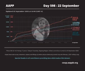 Egy mianmari és thaiföldi székelyű emberi jogi szervezet az Assistance Association for Political Prisoners (AAPP) által kiadott jelentés szerint szeptember 22-ig a katonai junta igazolhatóan 2311 embert ölt meg a demokráciapárti mozgalmakban való részvétel miatt. A bebörtönzött politikai foglyok jogaival foglalkozó szervezet szerint ezek csak az igazolható esetek, az áldozatok valódi száma ennél jóval magasabb lehet. Az AAPP összesen 12 462 fogvatartottról, valamint 126 halálraítéltről tud.
